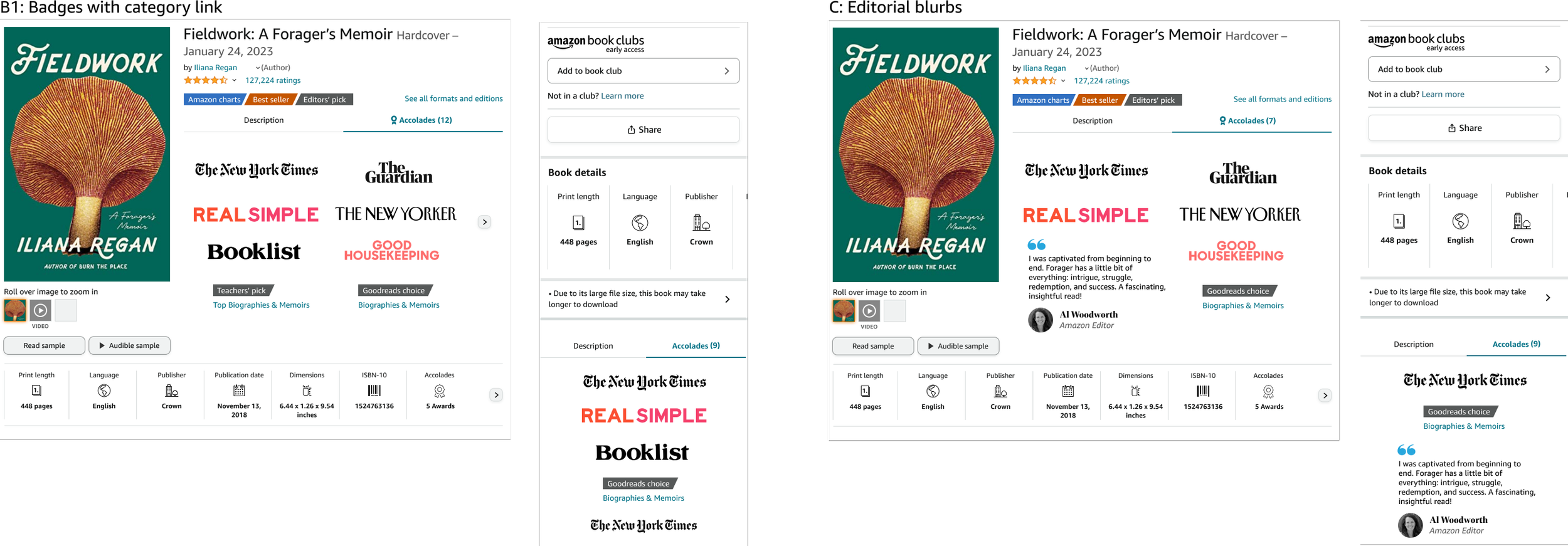 Currently, customers are presented with several types of accolades throughout the book's detail page, both above (ATF) and below the fold (BTF).